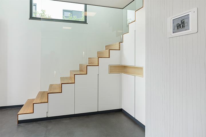 Weniger geeignet sind offene Treppenkonstruktionen oder solche mit eingeschränkter Höhe, beispielsweise Stahlwangentreppen, da hier weniger Platz für geschlossene Abstellräume bleibt.