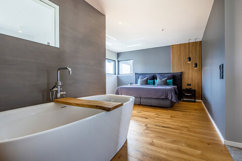 Beim Satteldach Klassik 219 ist das stilvolle Badezimmer direkt im Schlafzimmer integriert - ein Paradebeispiel für das Bad en Suite. Eine freistehende Badewanne mit Blick ins Grüne bildet das Herzstück des Schlaf- und Badezimmers und lädt zu entspannten Momenten ein.