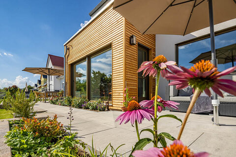 Das Satteldachhaus mit Erker besticht durch seine Holzverschalung, die eine freundliche und einladende Atmosphäre schafft. Die Besonderheit dieses Hauses zeigt sich in der konsequenten Umsetzung großer Fensterflächen im Erd- sowie im Obergeschoss, die den Erker gekonnt in Szene setzen. Insbesondere im Essbereich schafft es einen lichtdurchfluteten Raum, der Offenheit und Weite ausstrahlt.