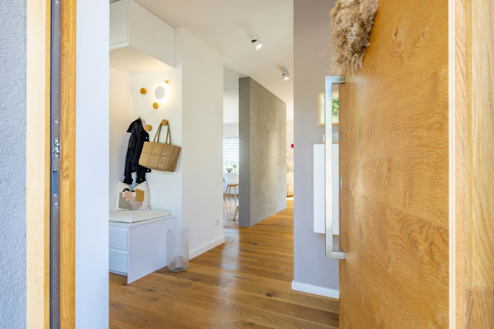 Ein heller Flur wirkt automatisch großzügiger. Neben hellen Wandfarben können Sie Innentüren in der Wandfarbe streichen, sodass sie optisch zurücktreten. Dadurch entsteht ein ruhiger, harmonischer Gesamteindruck.