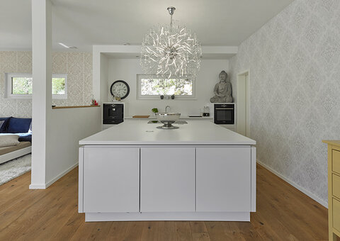 Beginnen wir mit dem, was in schwierigen Zeiten gut für die Seele ist: gemeinsame Mahlzeiten. Das tägliche Kochen und die gemeinsamen Mahlzeiten sind derzeit für viele Herausforderung und Belohnung zugleich. Planen Sie die Küche so, dass Sie die maximal denkbare "Standardbelegung", also zum Beispiel auch die Partner der Kinder oder eventuell Großeltern, gut über einen längeren Zeitraum versorgen können, ohne dass Sie in puncto Tischgröße oder Kochkapazitäten in Stress geraten. Richten Sie die Größe der Arbeitsfläche auf mehrere Personen aus, denn das gemeinsame Kochen schafft Raum für Kommunikation. Planen Sie für Geschirrmengen und große Töpfe genügend Schrankraum ein, und setzen Sie auf ausziehbare Tische und zusätzliche Stühle.