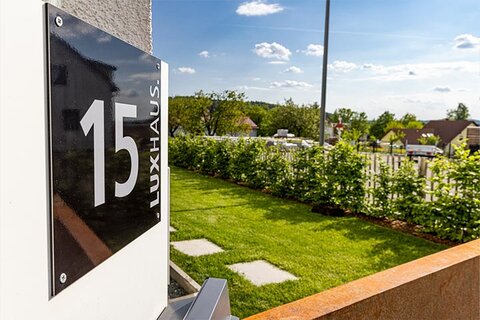 Ein sehr wichtiger und formal notwendiger Bestandteil ist die Hausnummer. Hier gibt es viele Varianten, z.B. als Leuchtziffer, in Verbindung mit dem Briefkasten oder beispielsweise im Stil eines kleinen Straßenschildes. Vielleicht kennen Sie auch bereits die LUXHAUS Hausnummer, die Bauherren auf Wunsch in einer von vier Farbkombinationen zu ihrem Haus dazubekommen können.