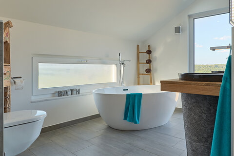 Ein warmes Bad mit Blick in die Natur – Zeit um ganz bei sich zu sein. Eine sorgfältig geplante Raumaufteilung im Badezimmer samt Platzierung der Badewanne und harmonierende Materialien bilden den perfekten Rahmen für entspannte Bademomente.