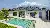 Der offen gestaltete Wohnbereich und die schwarze Küche mit Insel sind durch große Fensterflächen geprägt, die den Raum trotz dunkler Farben hell und einladend erscheinen lassen. Besonders das Sitzfenster mit unverbaubarem Blick auf den Sonnenuntergang und den Pool lädt zum Verweilen ein. Auf der Terrasse schaffen der Pool sowie die gepflanzten Palmen und Olivenbäume ein Urlaubsfeeling im eigenen Zuhause.