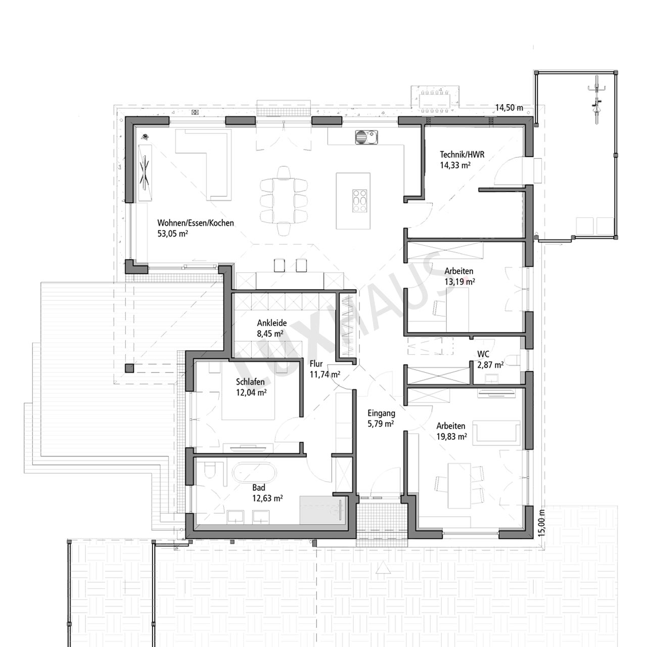 Ein moderner und luxuriöser Bungalow, der ideal für zwei Personen konzipiert ist und Wohnen sowie Arbeiten unter einem Dach vereint. Alle Wohnbereiche befinden sich auf einer Ebene, sodass auch im Alter ein komfortables Wohnen gewährleistet ist. Zwei separate Büros bieten individuelle Rückzugsorte und können bei Bedarf leicht in Gästezimmer umgewandelt werden.