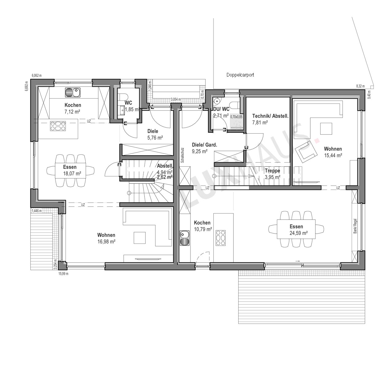 Ein modernes Duschbad sowie ein separater Technik- und Hauswirtschaftsraum sorgen für funktionale Ergänzungen im täglichen Ablauf. Der direkte Zugang zum Doppelcarport schafft zusätzlich kurze Wege und praktische Vorteile – gerade im Alltag ein spürbarer Mehrwert.