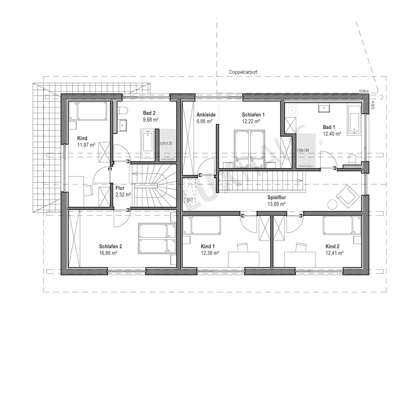Im Obergeschoss stehen drei Zimmer zur Verfügung, die flexibel als Kinder-, Arbeits- oder Gästezimmer genutzt werden können. Ein zentraler Spielflur verbindet die Räume miteinander und schafft gleichzeitig Platz für Spiel, Kreativität oder konzentriertes Arbeiten. Das Elternschlafzimmer bietet mit angeschlossener Ankleide einen separaten Rückzugsbereich. Das geräumige Bad mit Tageslicht schafft eine angenehme Atmosphäre für den Start in den Tag – funktional ausgestattet, zugleich hochwertig und wohnlich.