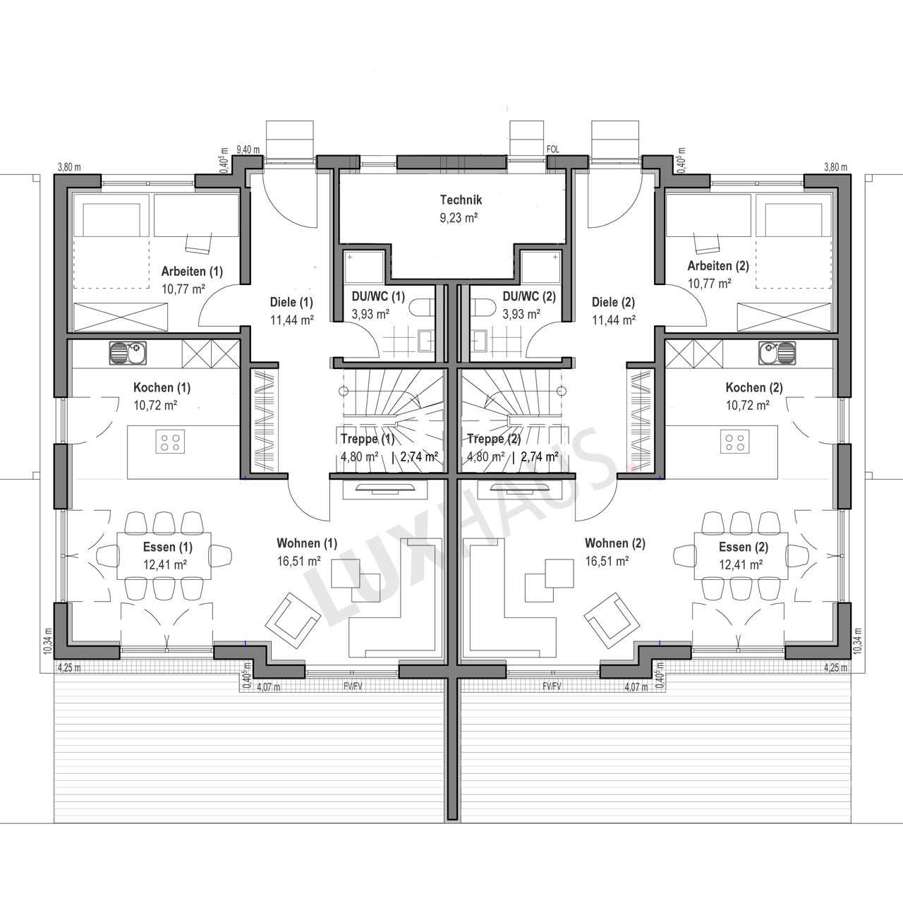Betritt man die rechte Haushälfte, liegen links vom Eingang der Technikraum und ein Dusch-WC, während sich rechts ein flexibel nutzbares Gäste- oder Arbeitszimmer befindet. Dadurch kann ein autarker Gästebereich mit vollwertigem Bad entstehen. Die Diele führt weiter zur Treppe sowie in den offenen Wohn-, Ess- und Kochbereich, der durch ein Schiebeelement und eine doppelflügelige Tür direkten Zugang zum Außenbereich bietet.