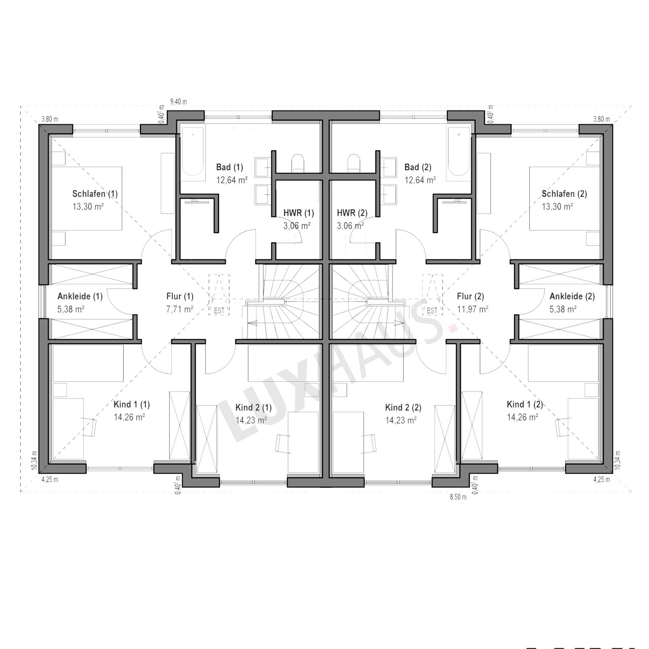 Im Obergeschoss ist die Verkehrsfläche minimiert, sodass der Platz optimal genutzt wird. Von hier aus gelangt man in das Elternschlafzimmer, das Bad, die Ankleide sowie zwei gleich große Kinderzimmer. Die linke Haushälfte spiegelt diesen Grundriss exakt.