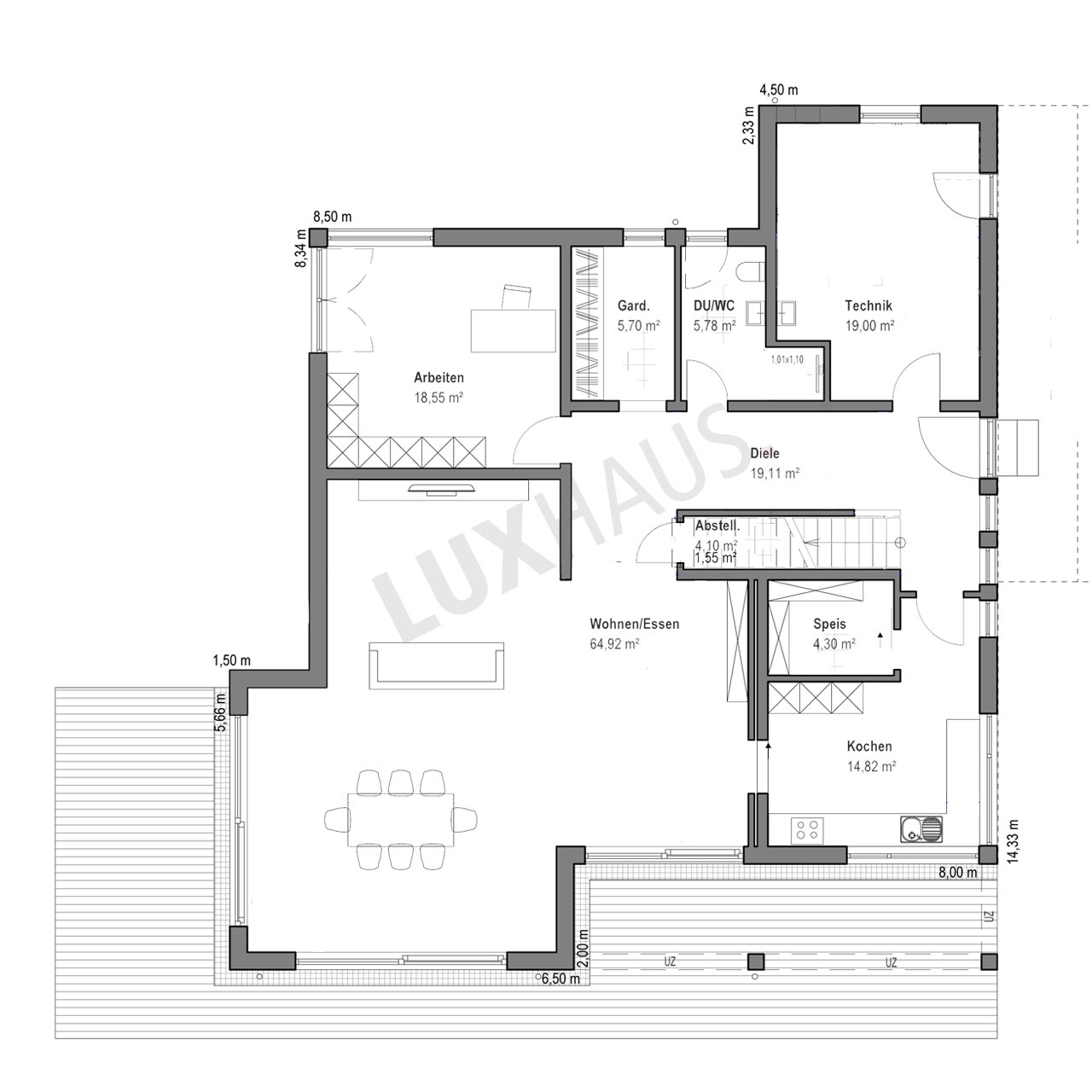 Der Grundriss mit Luftraum prägt nicht nur die Architektur, sondern auch die Wohnqualität. Der offene Wohn- und Essbereich geht nahtlos in die Küche über und bildet das kommunikative Zentrum des Hauses. Hier wird gemeinsam gelebt, gekocht und genossen – mit maximalem Komfort und einem einzigartigen Raumgefühl.