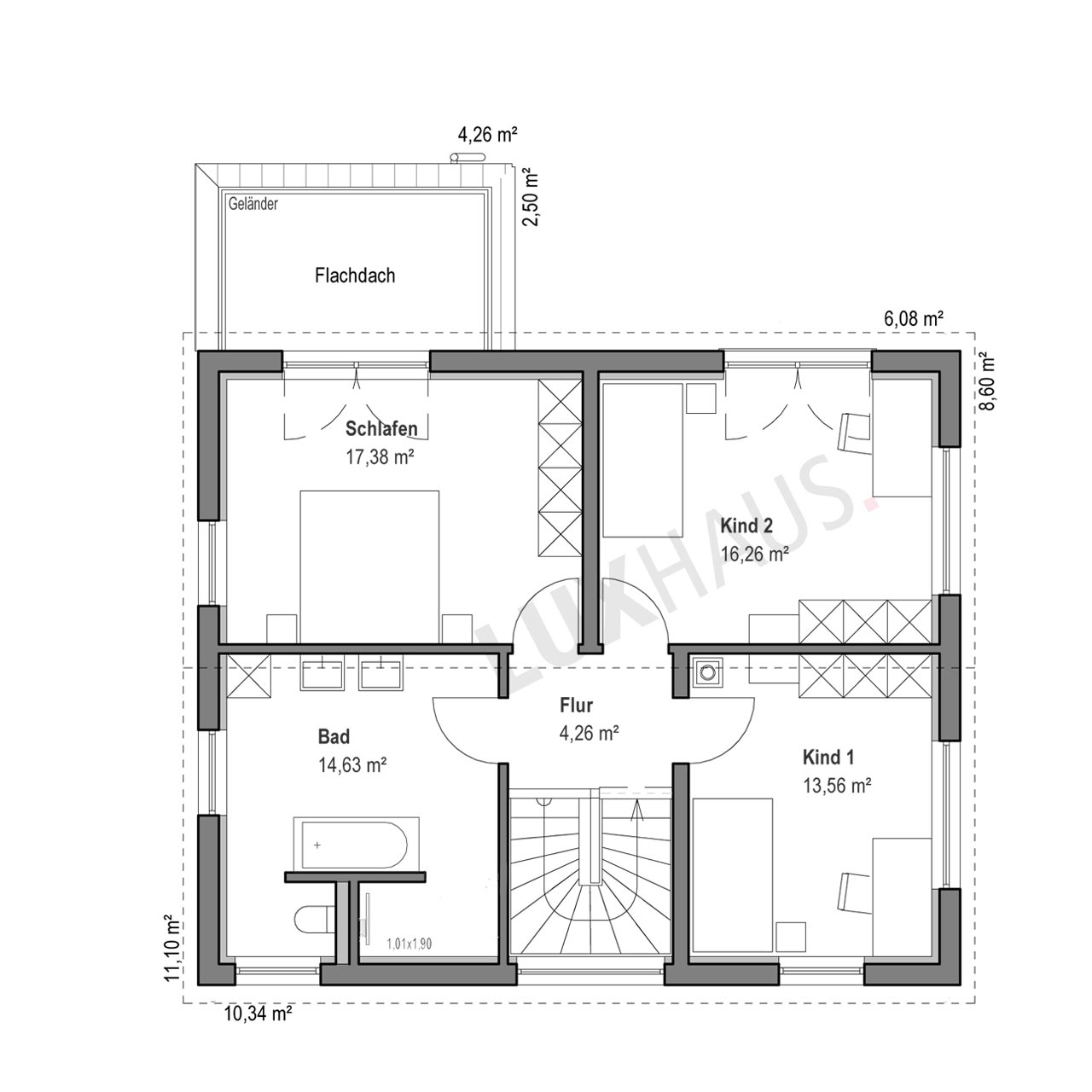 Im Obergeschoss setzt sich die hochwertige Gestaltung fort. Das großzügige Schlafzimmer mit bodentiefen Fenstern bietet Zugang zu einem privaten Balkon, der zum Verweilen einlädt. Dezente Farben und natürliche Materialien sorgen für eine ruhige, entspannte Atmosphäre. Die angrenzenden Kinderzimmer bieten viel Platz und Flexibilität für individuelle Gestaltungsmöglichkeiten.