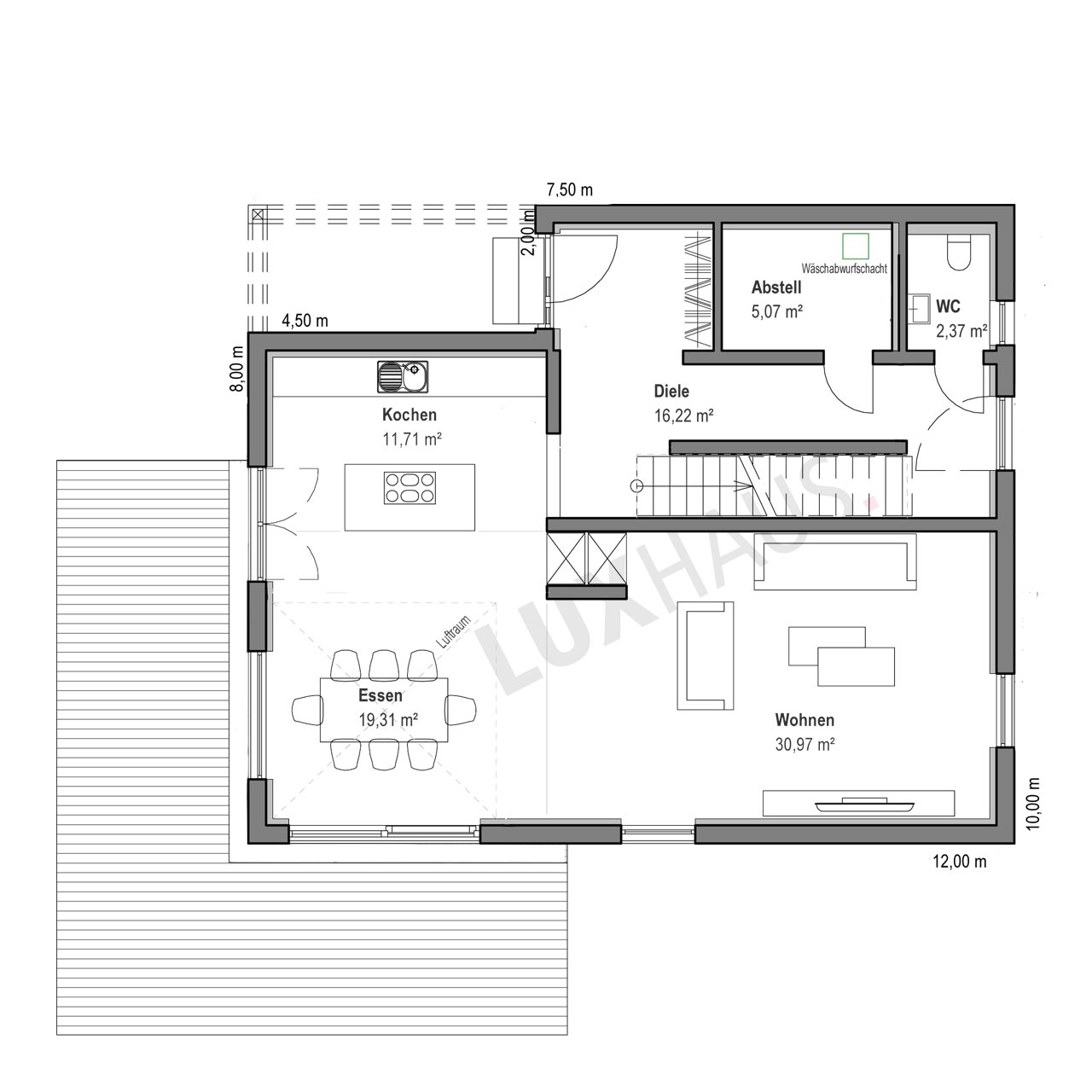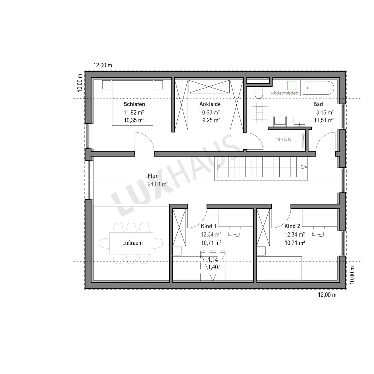 Im Erdgeschoss liegen direkt am Eingang WC, Abstellraum sowie eine separate Garderobennische. Über die geradlinige Treppe gelangt man ins Obergeschoss, das durch einen zentralen Flur erschlossen wird. Zwei gleich große Kinderzimmer, das Gemeinschaftsbad sowie der separate Elternbereich mit Schlafzimmer und Ankleide sind hier funktional und dennoch wohnlich angeordnet. Ein Highlight ist der Luftraum über dem Esszimmer, der ein großzügiges Raumgefühl vermittelt und den Wohnbereich noch offener wirken lässt.