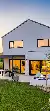 Kompakt und modern präsentiert sich dieses Satteldach ohne Dachüberstand mit weißer Fassade und anthrazitfarbenen Fenstern. Zur Straßenseite hin entsteht durch den Winkel von Haus und Garage ein geschützter Hofbereich, der eine elegante Annäherung an den überdachten Eingang ermöglicht. Die Gestaltung mit einem holzverschalten Seitenelement, das Klingel, Sprechanlage und Briefkasten beherbergt, setzt einen markanten Akzent. Die Kombination aus anthrazitfarbenen Funktionselementen und der hellen Putzfassade schafft einen modernen, kontrastreichen Auftritt, während das Holz eine warme Note einbringt.