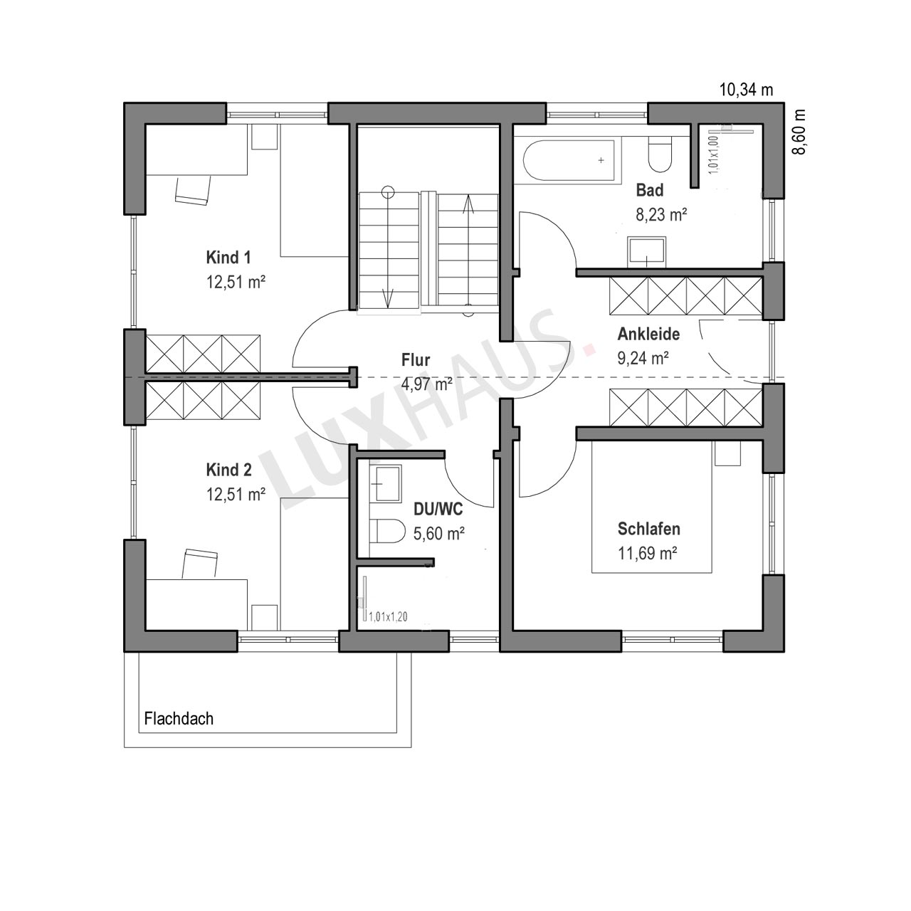 Im Obergeschoss steht die klare Trennung von Kinder- und Elternbereich im Fokus. Zwei gleich große Kinderzimmer mit zugehörigem Bad bieten ausreichend Rückzugsraum für den Nachwuchs. Der Elternbereich überzeugt mit durchdachter Funktionalität: Schlafzimmer, Ankleide und Bad sind als abgeschlossene Einheit gestaltet und sorgen für Privatsphäre und Komfort.