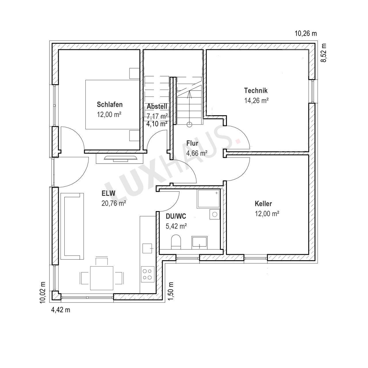 Im Erdgeschoss schafft der im Untergeschoss untergebrachte Haustechnikbereich zusätzlichen Platz für das tägliche Familienleben. Hier dominieren Offenheit und Kommunikation: Der weitläufige Wohn- und Essbereich mit direktem Zugang zur Küche und angrenzender Speisekammer wird zum zentralen Treffpunkt. Ergänzt wird das Raumangebot durch ein separates Gäste-WC sowie ein flexibel nutzbares Zimmer – ideal als Arbeits- oder Gästezimmer.