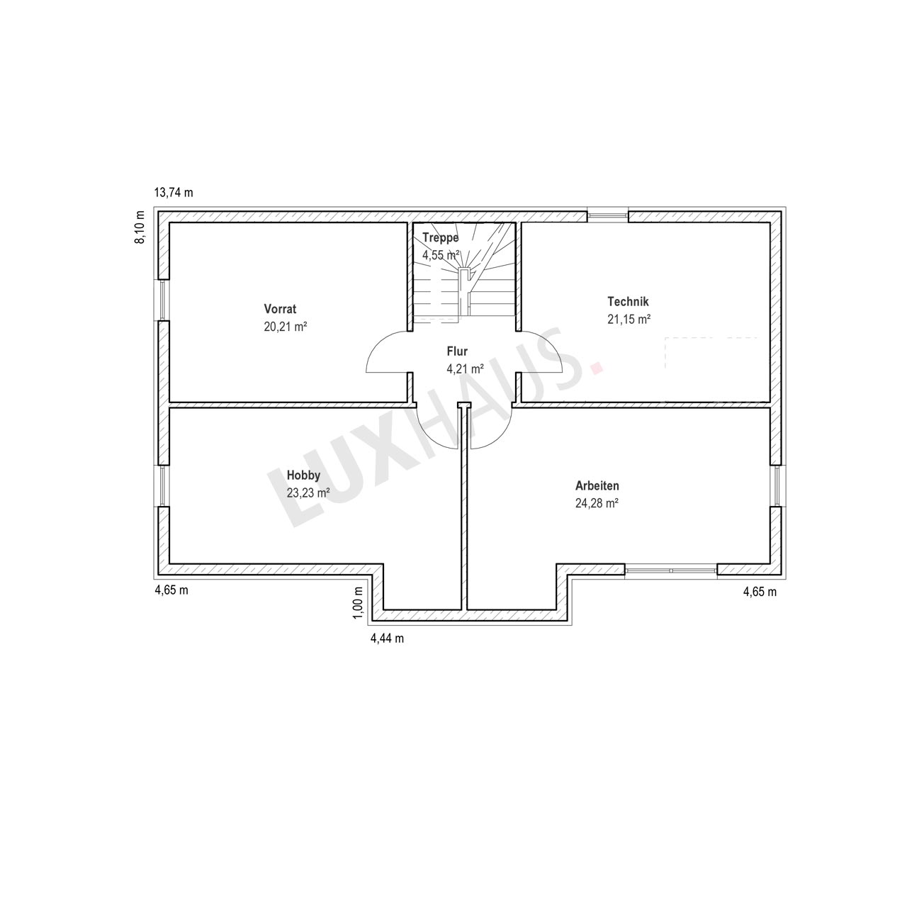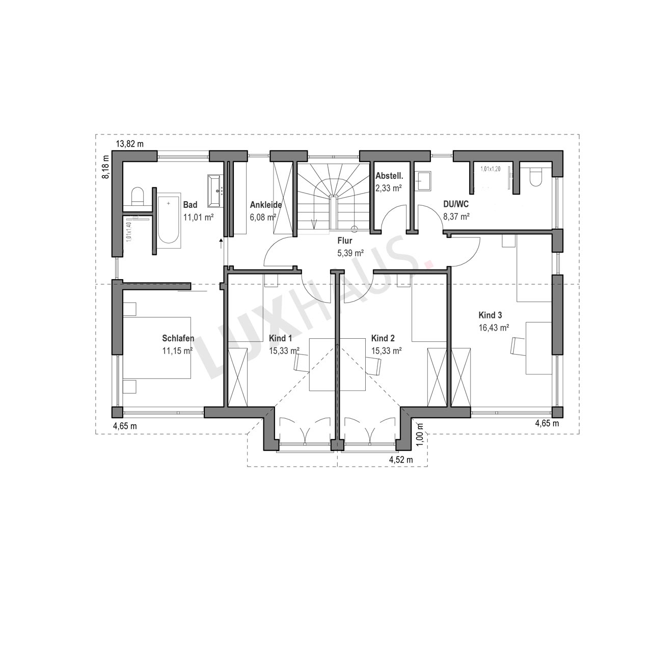 Im Dachgeschoss befinden sich neben dem Elternschlafzimmer mit Ankleide und Badezimmer drei gleichwertige Kinderzimmer, die flexibel nutzbar sind. Ergänzt wird die Ebene durch ein weiteres Duschbad und einen Abstellraum. Der Keller bietet mit Räumen für Technik, Hobby, Arbeiten und Vorrat zusätzlichen Raum für die individuelle Nutzung.