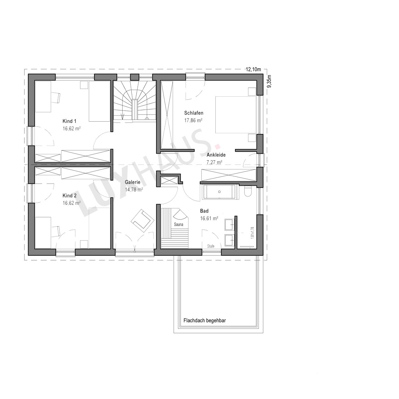 Im Obergeschoss setzt sich das durchdachte Raumkonzept fort: Zwei gleich große Kinderzimmer, ein großzügiges Schlafzimmer mit Ankleidebereich sowie ein Wellnessbad mit Sauna bilden eine stimmige Einheit. Helle Farben, warme Holzelemente und gezielt gesetzte Farbakzente schaffen eine angenehme, wohnliche Atmosphäre im gesamten Innenraum. Besonders hervorzuheben ist der direkte Zugang vom Bad zur begehbaren Dachterrasse, die dem Flachdachanbau zusätzliche Aufenthaltsqualität verleiht.