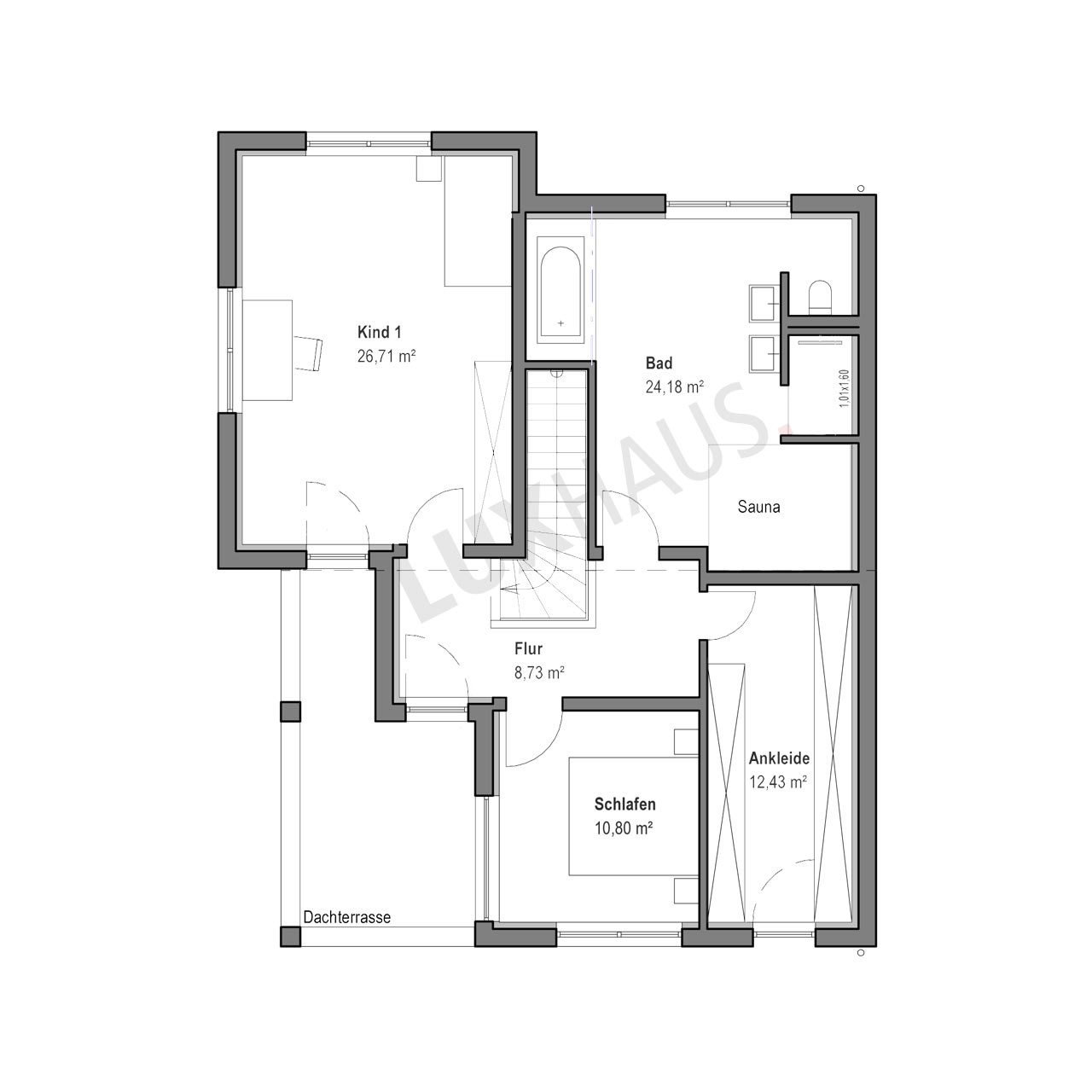 Ein echtes Highlight ist die überdachte Dachterrasse im Obergeschoss, welche von mehreren Räumen zugänglich ist – sowohl das Kinderzimmer, als auch die Galerie und das Schlafzimmer führen direkt hinaus. Der Wellnessfaktor wird durch das großzügige Bad mit integrierter Sauna perfekt ergänzt. Die geräumige Ankleide mit fast 14 m² rundet den Komfort auf stilvolle Weise ab.