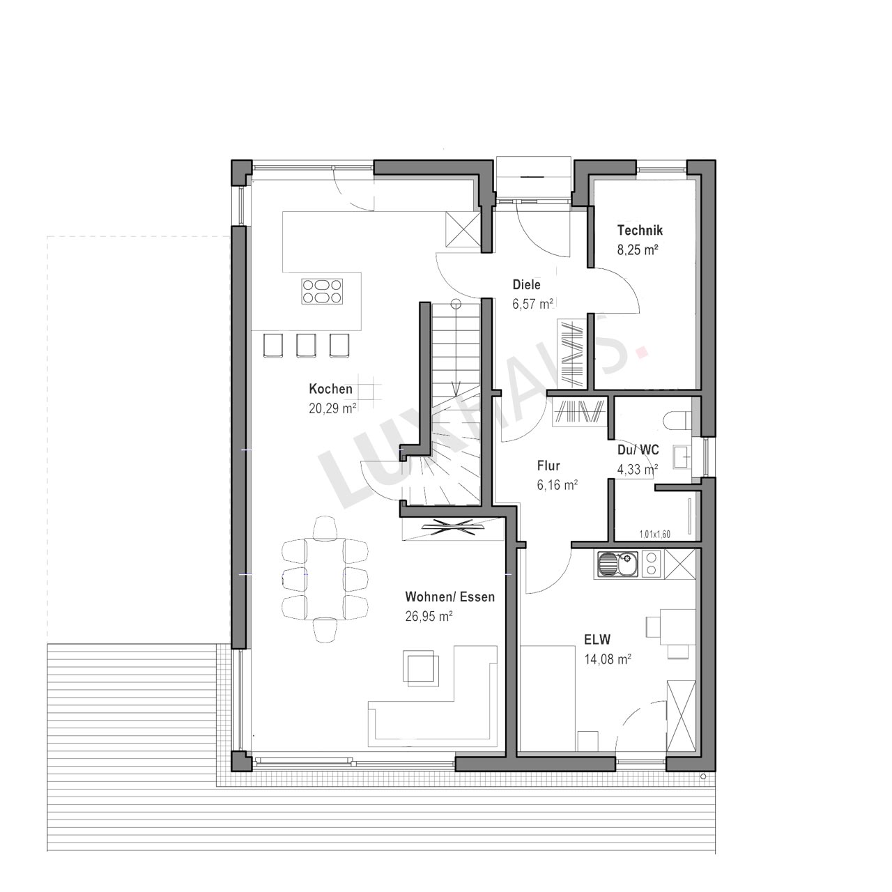 Der Verzicht auf einen Dachüberstand unterstreicht die klare und zeitgemäße Architektursprache. Im Erdgeschoss bildet der offen gestaltete Wohn-, Koch- und Essbereich das Zentrum des Hauses. Die großzügige Küche mit Küchenblock und integrierter Barlösung schafft eine harmonische Verbindung zwischen Funktionalität und Design. Großzügige Fensterflächen sorgen für helle, lichtdurchflutete Räume und einen fließenden Übergang zwischen Innen- und Außenraum.