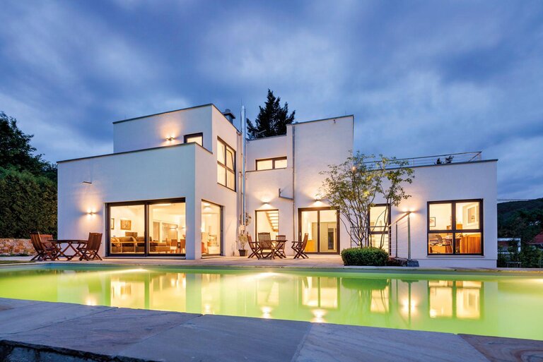 Highlight ist der sich vor dem Mittelteil erstreckende Swimmingpool, der dem Objekt genau die richtige Dosis Luxus verleiht.