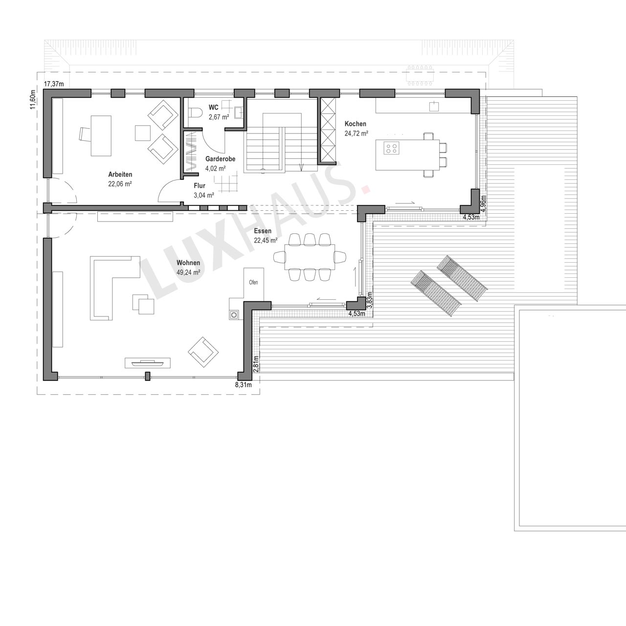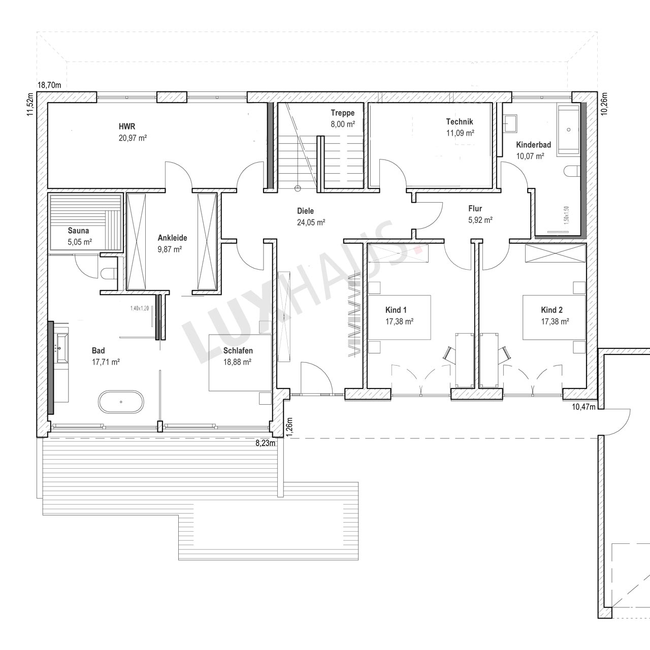 Die privaten Bereiche befinden sich im Erdgeschoss und sind optimal organisiert. Das Schlafzimmer verfügt über eine separate Ankleide und ein großzügiges Bad, das mit freistehender Badewanne, bodengleicher Dusche und Sauna Wellnesskomfort bietet. Zwei gleichwertige Kinderzimmer mit eigenem Kinderbad komplettieren den privaten Bereich. Die Treppe führt von hier aus direkt in den offen und lichtdurchflutet gestalteten Wohnbereich, der durch seine großzügige Gestaltung und eine leicht zurückversetzte Küche besticht. Ein separates Arbeitszimmer sowie eine Garderobe mit Einbauschrank runden das Raumkonzept ab. Gäste werden über einen eigenen Bereich empfangen und elegant in den repräsentativen Teil des Hauses geleitet, während die Familie sich im Alltag über kurze Wege und durchdachte Abläufe freuen kann.