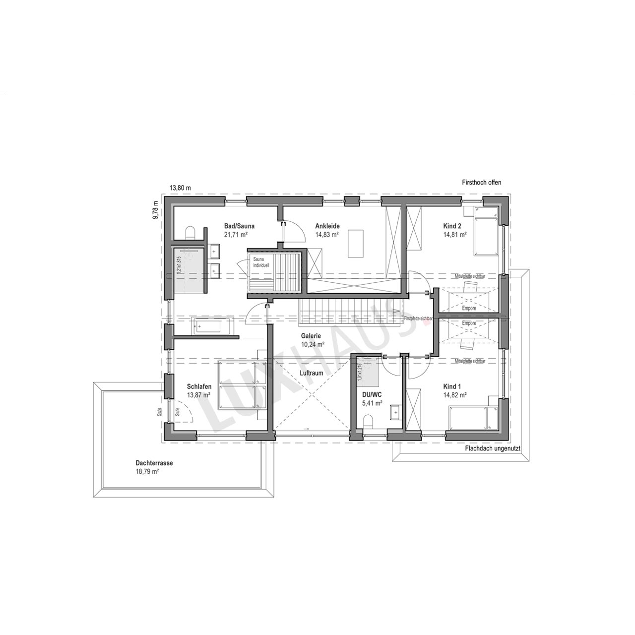 Das Obergeschoss wird durch die offene Galerie mit Blick in den Essbereich und in den Garten charakterisiert. Die Räume sind bis zum First offen gestaltet, ergänzt durch sichtbare Holzbalken, die dem Obergeschoss Wärme und Struktur verleihen. Auf der einen Seite befinden sich zwei identisch große Kinderzimmer – jeweils mit einer durch die Raumhöhe möglichen zweiten Ebene, nutzbar als Spiel- oder Schlafgalerie. Ergänzt wird dieser Bereich durch ein eigenes Kinderbad mit Dusche und WC. Die gegenüberliegende Haushälfte ist als privater Elternbereich konzipiert: Schlafzimmer, Ankleidezimmer und ein großzügiges Badezimmer mit integrierter Sauna bilden eine funktionale und zugleich private Einheit. Der Zugang erfolgt über eine zentrale Badezimmertür, wodurch ein eigener Rückzugsbereich entsteht – abgetrennt vom restlichen Obergeschoss.