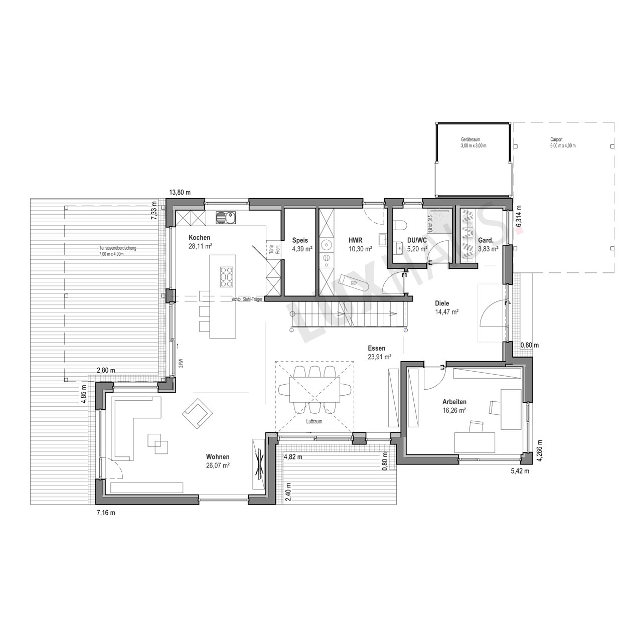Geradlinig weiter öffnet sich der Blick in den Essbereich – geprägt durch eine beeindruckende Galerie mit meterhoher Fensterfront. Diese sorgt nicht nur für maximale Tageslichtversorgung, sondern auch für ein außergewöhnliches Raumgefühl. Design-Pendelleuchten setzen stilvolle Akzente. Nach rechts geht der Bereich fließend in die Küche über, die mit einer großen Kochinsel, einem integrierten Weinkühler, einem offenen Stahlträger in Anthrazit und einer versteckten Speisekammer gleich mehrere architektonische und funktionale Highlights bietet. Nach links erschließt sich das Wohnzimmer, das im seitlichen Anbau untergebracht ist – großzügig dimensioniert und mit viel Platz für eine gemütliche Sofalandschaft. Ebenfalls im Erdgeschoss: der Hauswirtschaftsraum mit praktischer Anbindung an Küche und Wohnbereich.
