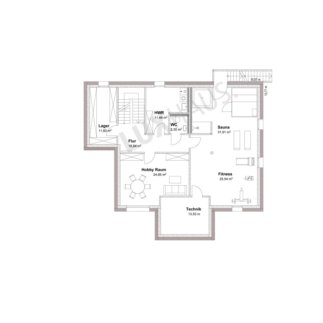 Das Kellergeschoss ist mehr als nur ein funktionaler Nutzraum – es erweitert das Wohnkonzept um luxuriöse Erlebnismomente. Der große Fitnessraum mit angeschlossener Sauna bietet einen separaten Außenzugang. Ein Whirlpool lädt zum Entspannen ein, während der Hobbyraum als voll ausgestattetes Heimkino genutzt wird – mit perfekter Akustik und optimaler Lichtsteuerung. Technik-, Lager- und Hauswirtschaftsraum sind intelligent integriert, ohne den klaren Designanspruch zu stören.