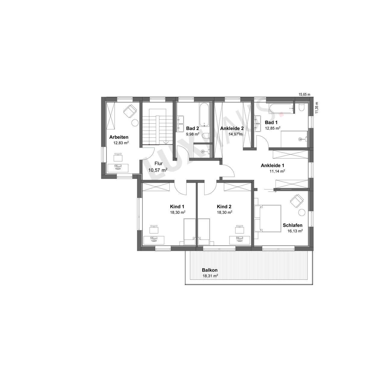 Im Obergeschoss bietet die Stadtvilla zwei große Kinderzimmer, zwei Ankleiden sowie ein exklusives Hauptschlafzimmer mit Zugang zum Balkon. Zwei stilvolle Bäder mit Walk-in-Dusche, großzügiger Badewanne und hinterleuchteten Spiegeln unterstreichen den Anspruch an modernes Design und Funktionalität. Auch hier: intelligente Beleuchtung, edle Materialien und hochwertige Armaturen.