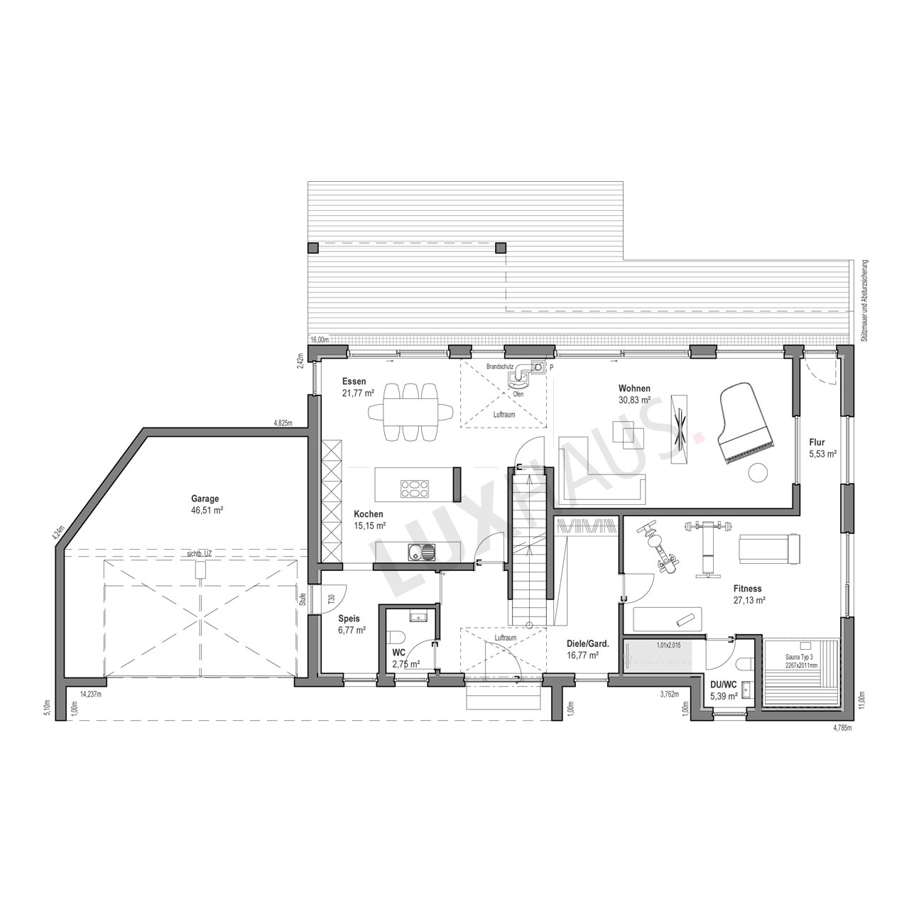 Im Mittelpunkt steht der großzügige Wohn- und Essbereich mit beeindruckendem Luftraum, der dem Haus eine offene, weite Atmosphäre verleiht. Die Speisekammer, sowohl von der Küche als auch vom Flur aus erreichbar, sorgt für kurze Wege im Alltag. Rechterhand des Eingangs wurde ein Sportbereich mit Sauna integriert – ideal, um Entspannung und Bewegung in den Tagesablauf zu integrieren.