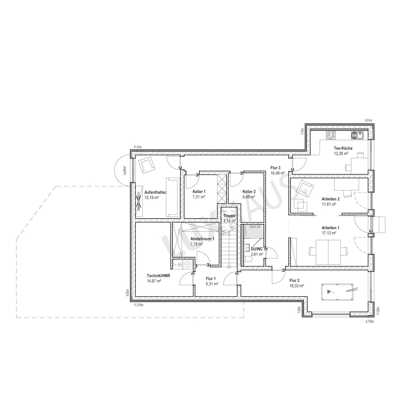 Eine Besonderheit stellen die im Kellergeschoss gelegenen Unternehmensräume dar, die funktional in das Gesamtbild eingebunden sind und gleichzeitig eine klare Trennung zwischen privatem und beruflichem Bereich ermöglicht.