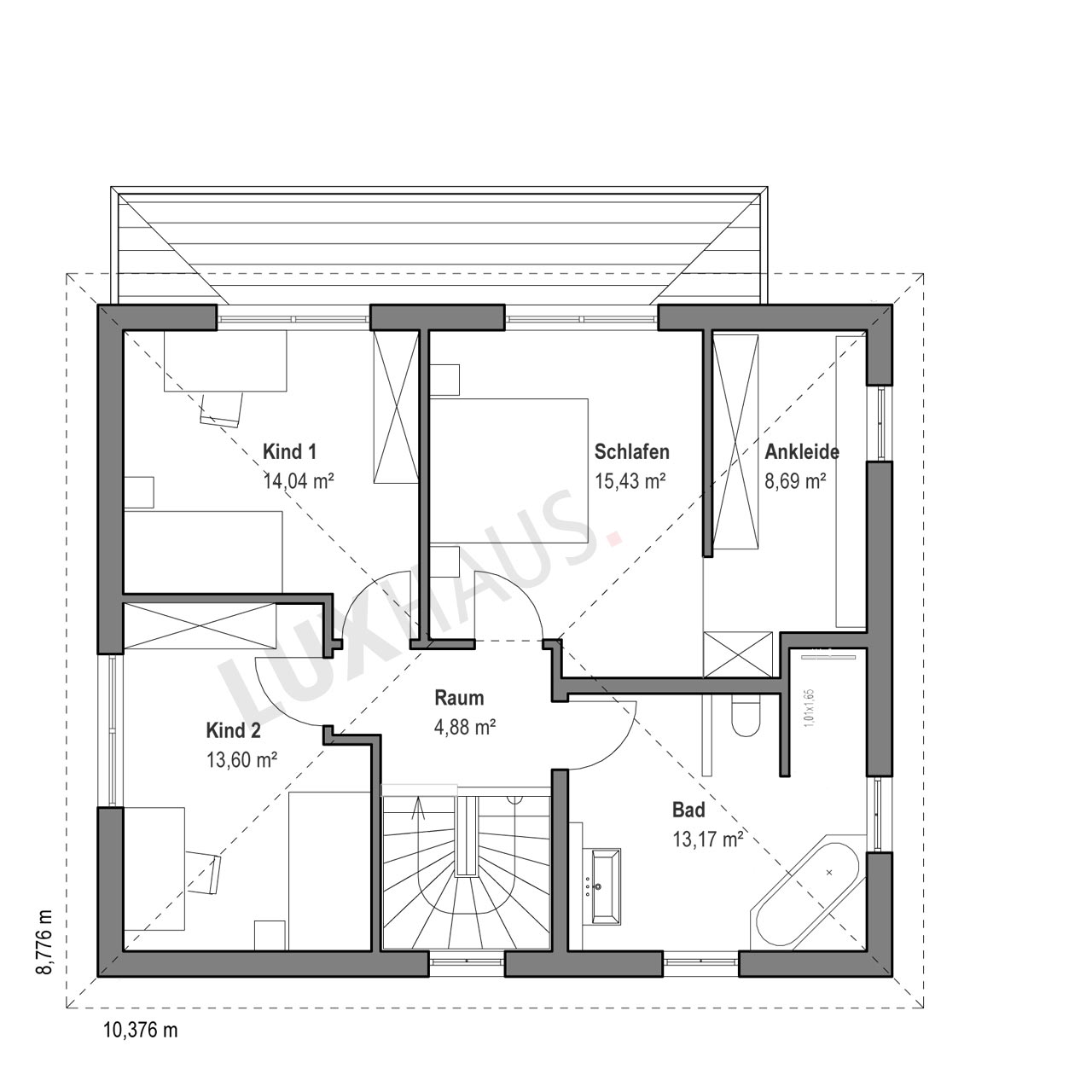 Zwei gleichwertige Kinderzimmer im Obergeschoss bieten Privatsphäre und individuelle Rückzugsorte. Sie lassen sich flexibel nutzen und gestalten, ganz nach den Bedürfnissen der Bewohner. Der Stauraum unter der Treppe schafft zusätzlichen Platz für Alltagsgegenstände, die nicht immer sichtbar sein sollen, während der Technik- und Hauswirtschaftsraum weiteren praktischen Raum bietet.