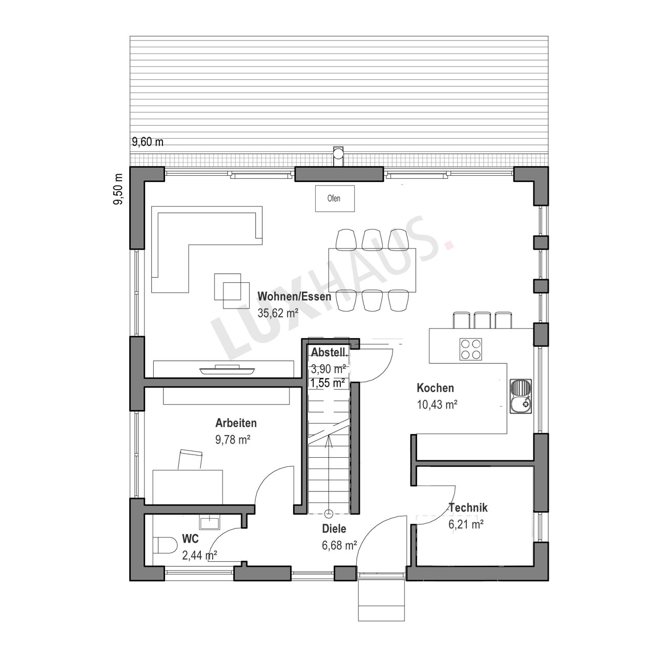 Der rund 46 m² große Wohn- und Essbereich bildet das Herzstück des Hauses und überzeugt mit Großzügigkeit, Offenheit und einer einladenden Atmosphäre. Offen gestaltet und mit direktem Zugang zur Terrasse, wirkt dieser Bereich repräsentativ und gastfreundlich. Ergänzt wird das Erdgeschoss durch ein separates Arbeitszimmer, das ideale Bedingungen für Homeoffice, Hobbys oder auch als Gästezimmer bietet. Die Möglichkeit zur flexiblen Nutzung macht den Grundriss besonders anpassungsfähig.