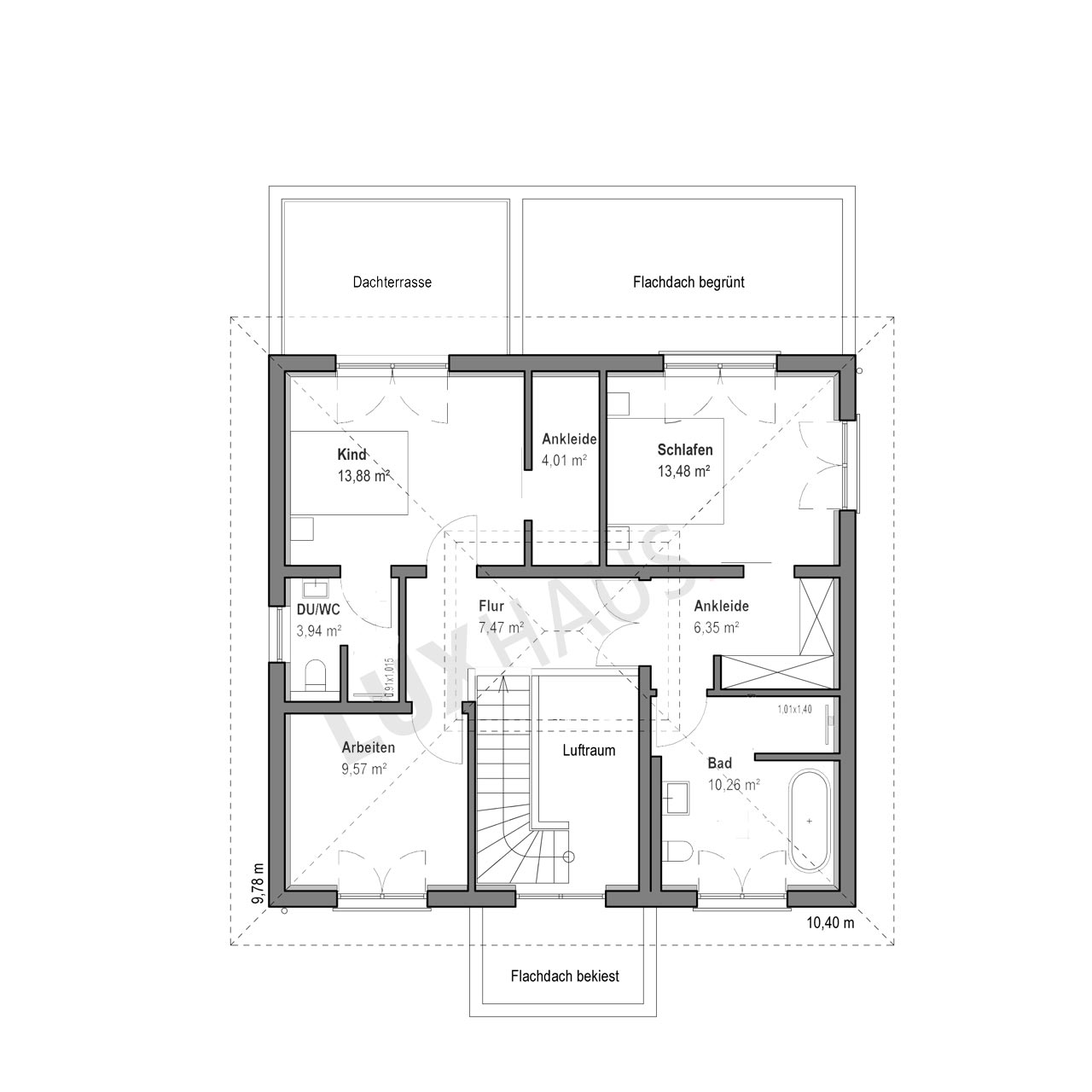Im Obergeschoss bietet diese moderne Landhausvilla mit Walmdach eine durchdachte Raumaufteilung. Der Kinderbereich ist mit einem eigenen Bad, einer begehbaren Ankleide und direktem Zugang zur Dachterrasse ausgestattet – ein idealer Rückzugsort für den Nachwuchs. Der Elternbereich verfügt über ein komfortables Schlafzimmer, eine großzügige Ankleide sowie ein Wellnessbad, das mit freistehender Badewanne und bodengleicher Dusche überzeugt. Ein separates Arbeitszimmer rundet das Raumangebot auf dieser Ebene ab.
