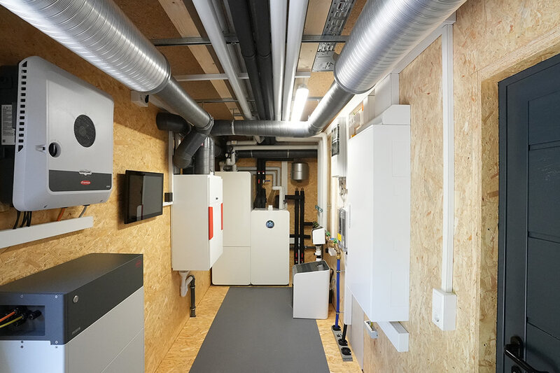 Sämtliche haustechnischen Komponenten wie Heizung, Lüftung, Warmwasserspeicher, Batteriespeicher für die Photovoltaikanlage sowie die gesamte Elektro- und Hausanschlusstechnik werden platzsparend in der Garage integriert. So entsteht im Haus zusätzlicher Freiraum, der vielfältig genutzt werden kann – für offene Grundrisse, mehr Wohnfläche oder individuelle Gestaltungsideen.