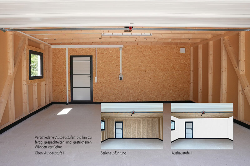 Die Größe Ihrer Garage ist frei planbar und unabhängig von Rastermaßen. Ob freistehend oder als Anbau – Sie haben die Wahl. Ebenso wie bei der Hausplanung stehen Ihnen verschiedene Ausbaustufen zur Verfügung, individuell abgestimmt auf Ihre Wünsche und Bedürfnisse. Von der sichtbaren Holzständerkonstruktion bis hin zum fertigen Anstrich – alles ist möglich.
